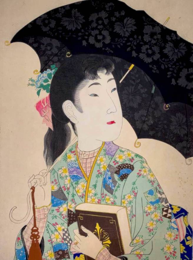 A quite famous cha-ya musume was Naniwaya Okita (難波屋, born 1778), who was a female employee of a cha-ya located close to the famous Buddhist temple Sensō-ji. She became one of the favourite subjects of ukiyo-e artist Kitagawa Utamaro, whom he enshrined as one of the ‘three beauties of the present day’ in a print of the same name. Due to the fame she gained through the prints, Okita became the ‘poster girl’ of the shop, with some customers believed to travel far and white for a glimpse of this fair young lady.
