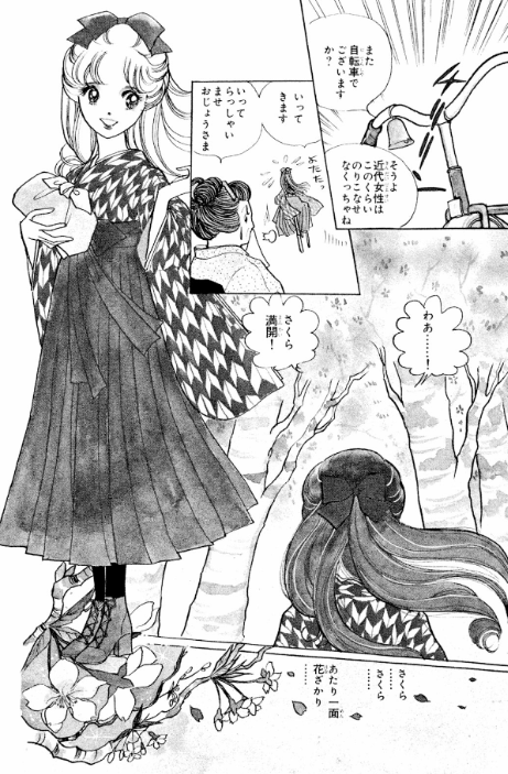 A well-known example of the hakama look in popular culture is the shōjo manga Haikara-San: Here Comes Miss Modern (Haikara-san ga Tōru; はいからさんが通る) by Waki Yamato, serialised between 1975 and 1977. Set in Tokyo during the early 20th century, the story follows spirited and headstrong schoolgirl Benio Hanamura, who refuses to conform to the societal expectations of her time.