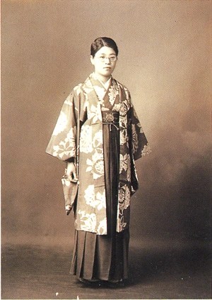 Female student wearing a meisen kimono and haori combined with a women‘s hakama. Source unknown.
