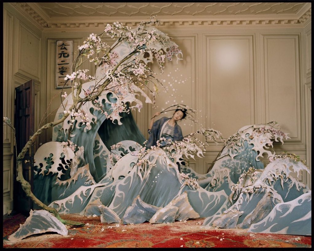 The first room gave a brief history over the career of Tim Walker, with the walls being filled with photographic images forming a sort of retroperspective of the artist’s creative ventures so far. Among them was the famous image of musicians Mari Hirao and Yui Yamamoto clad in full geisha kimono ensembles while operating Gen h-4 flying machines you can see below. Another one was one of my favourites by the artist which portrays model Xiao Wen Ju placed into a recreation of Hokusai‘s popular ukiyo-e woodblock print ‘The Great Wave off Kanagawa‘.